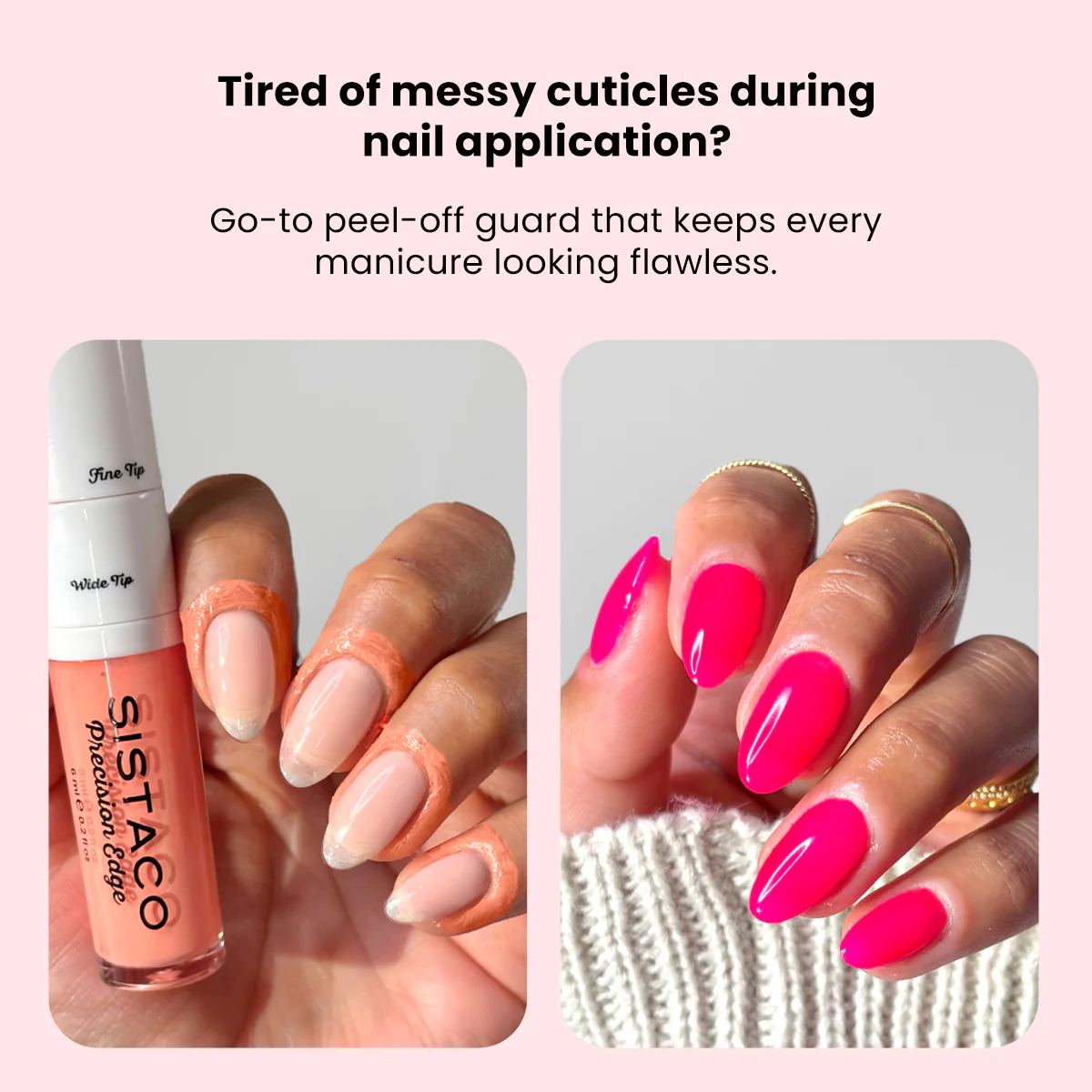 Sistaco Precision Edge is a must-have product. Prevents your application from going over the nail edge and onto the skin which further provides a professional standard finish. Comes in a container that gives you two brush choices for application; one thick and one with a fine tip allowing total control when applying. Clean lines, crisp finishes every time along with added longevity as preventing formulation on the skin, also helps prevent lifting.